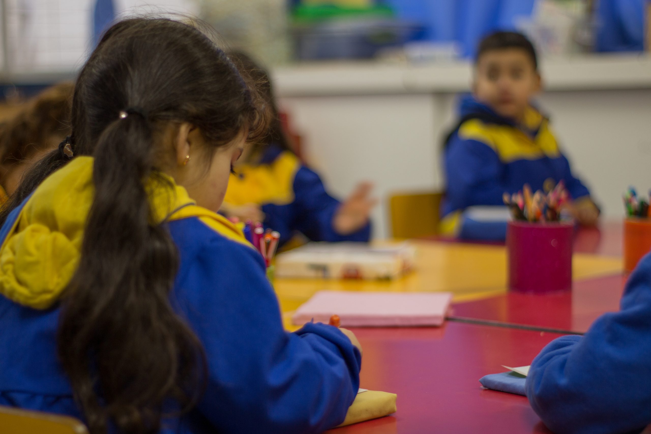 Damas y varones: Buzo del Colegio, zapatillas blancas o negras, delantal azul con amarillo. Accesorios y parkas, azul marino.